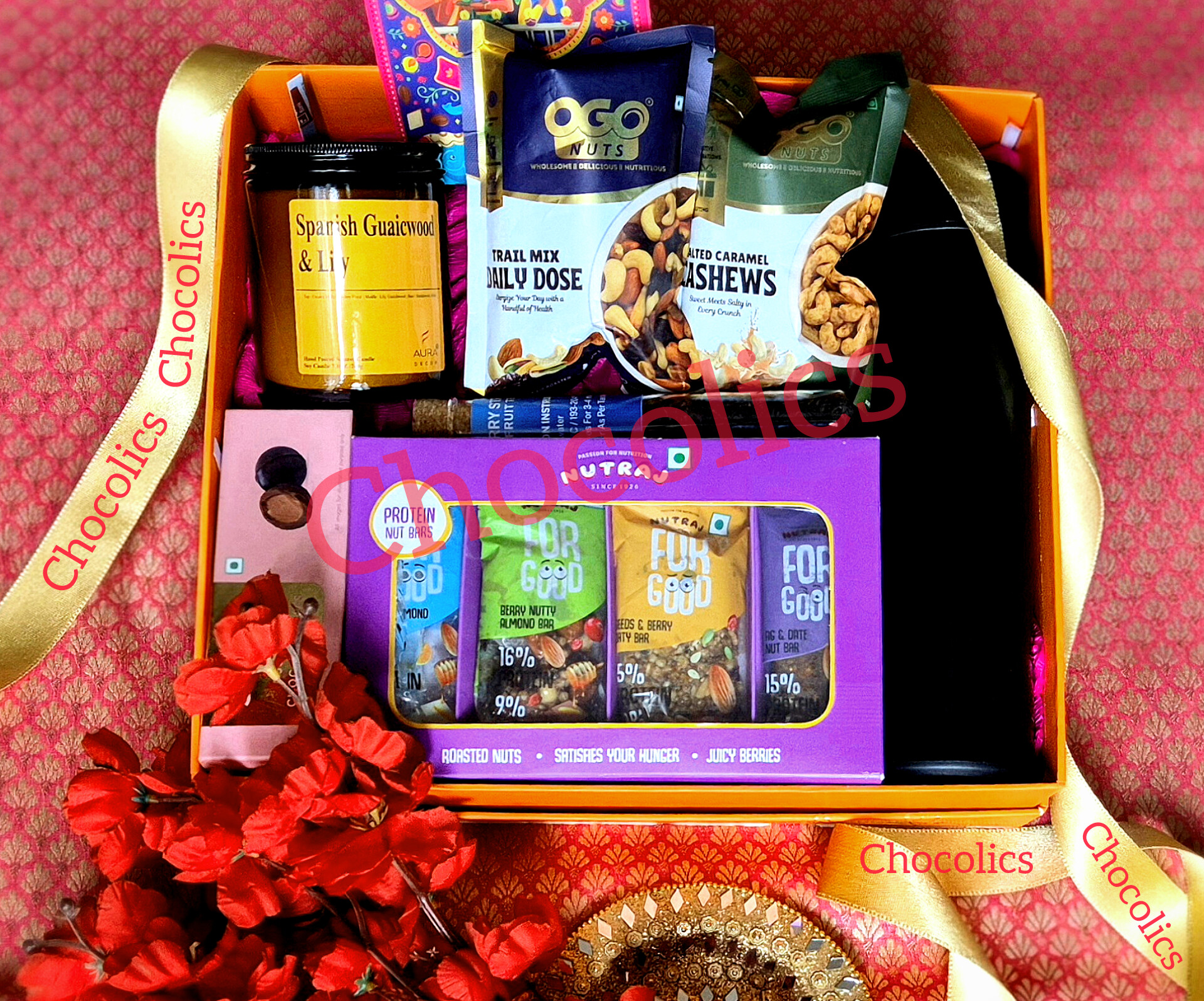 Presented in a striking orange box adorned with a golden ribbon and surrounded by vibrant red petals, this hamper is a feast for the senses. Here’s a comprehensive list of the curated items, each selected to blend indulgence with festivity: