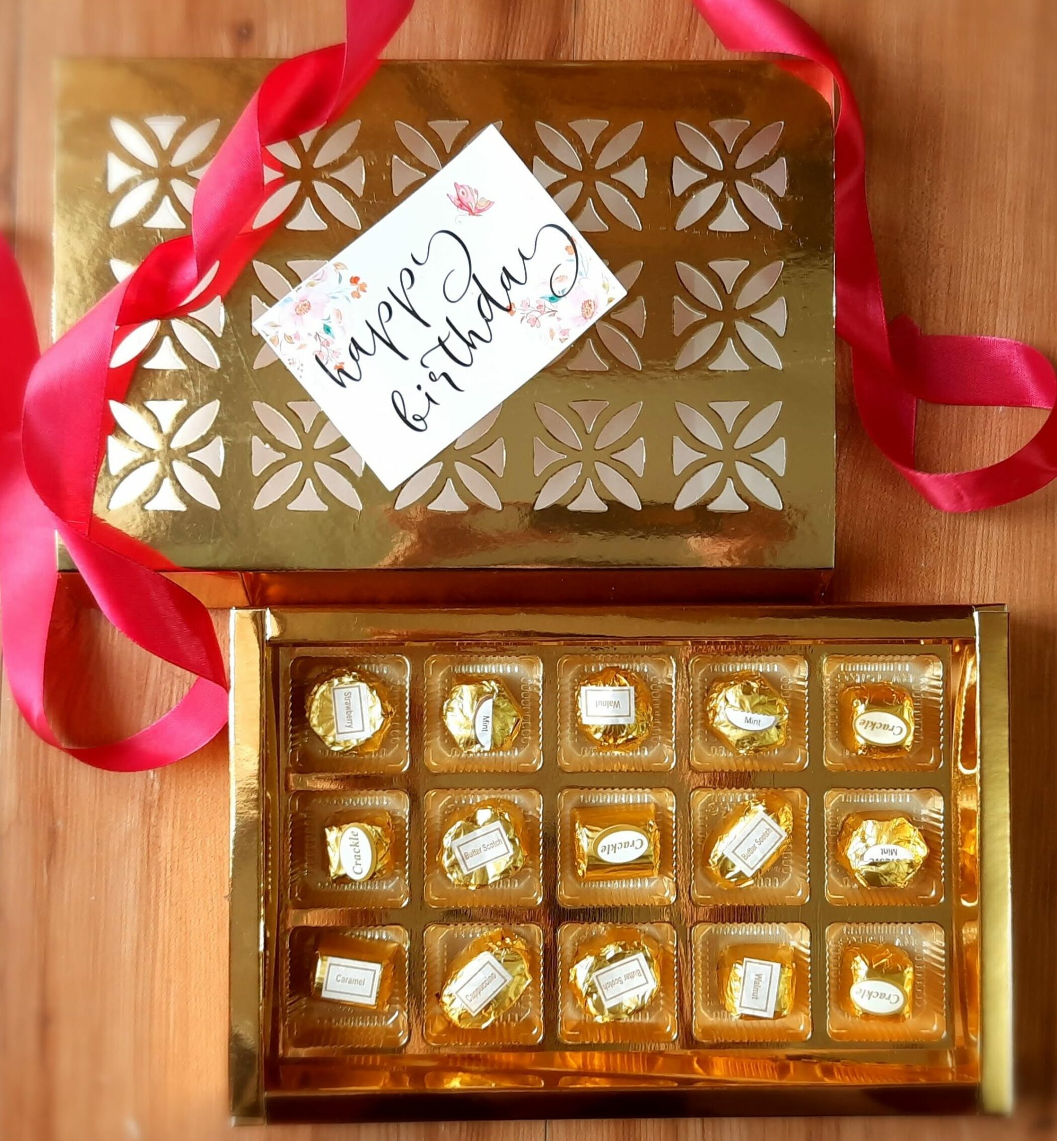 Flavours : We have a variety of flavours included in every box – Butterscotch, strawberry, caramel, fruit n nut, roasted almonds, mint, plain, coconut truffle, tropical orange, coffee truffle, rum truffle(non alcoholic), walnut fudge