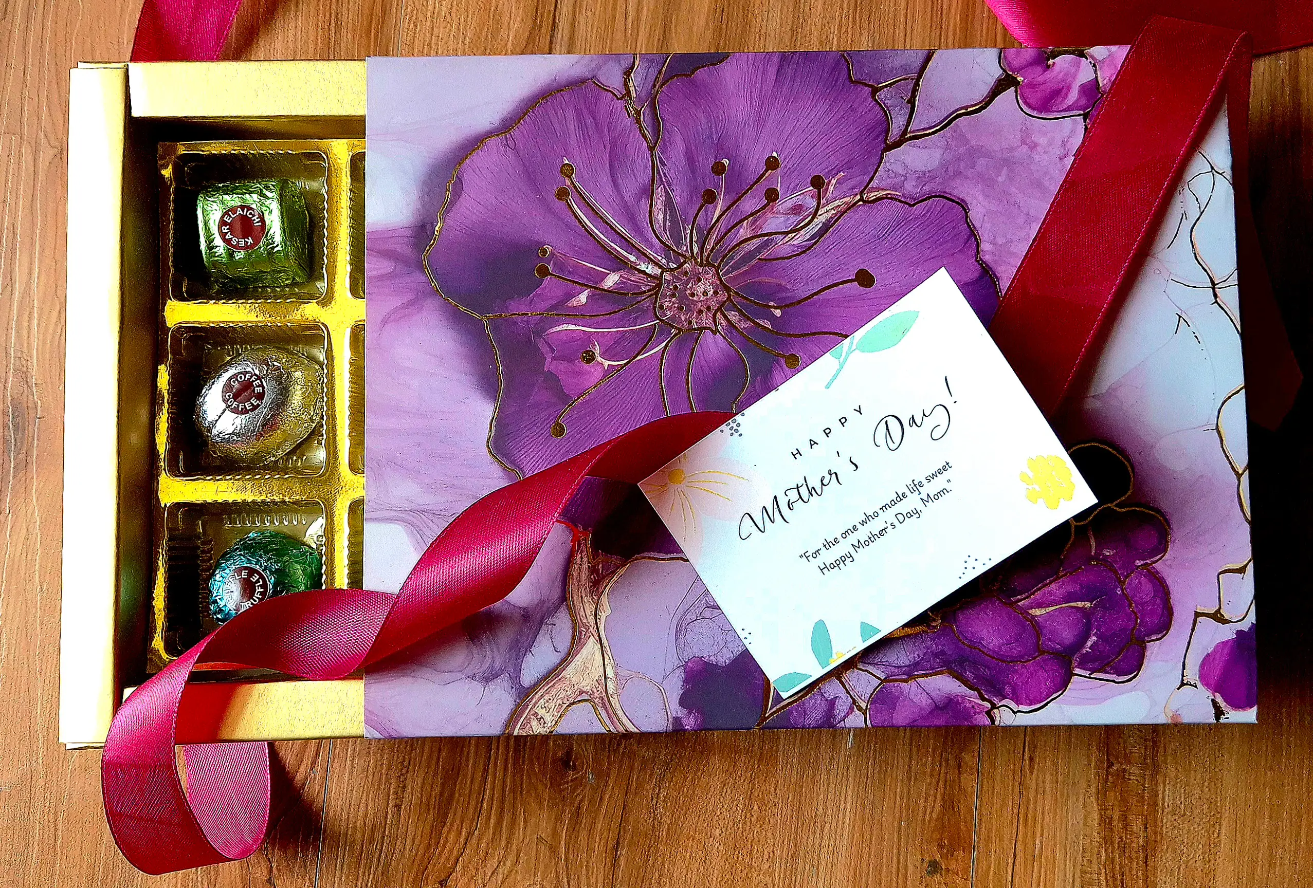 Keywords: Mother’s Day chocolate gift box, personalized chocolate gift, luxury assorted chocolates, gourmet chocolate box, custom message gift, elegant chocolate packaging, floral gift box with gold foil, premium chocolates for her, gift ideas for mom.