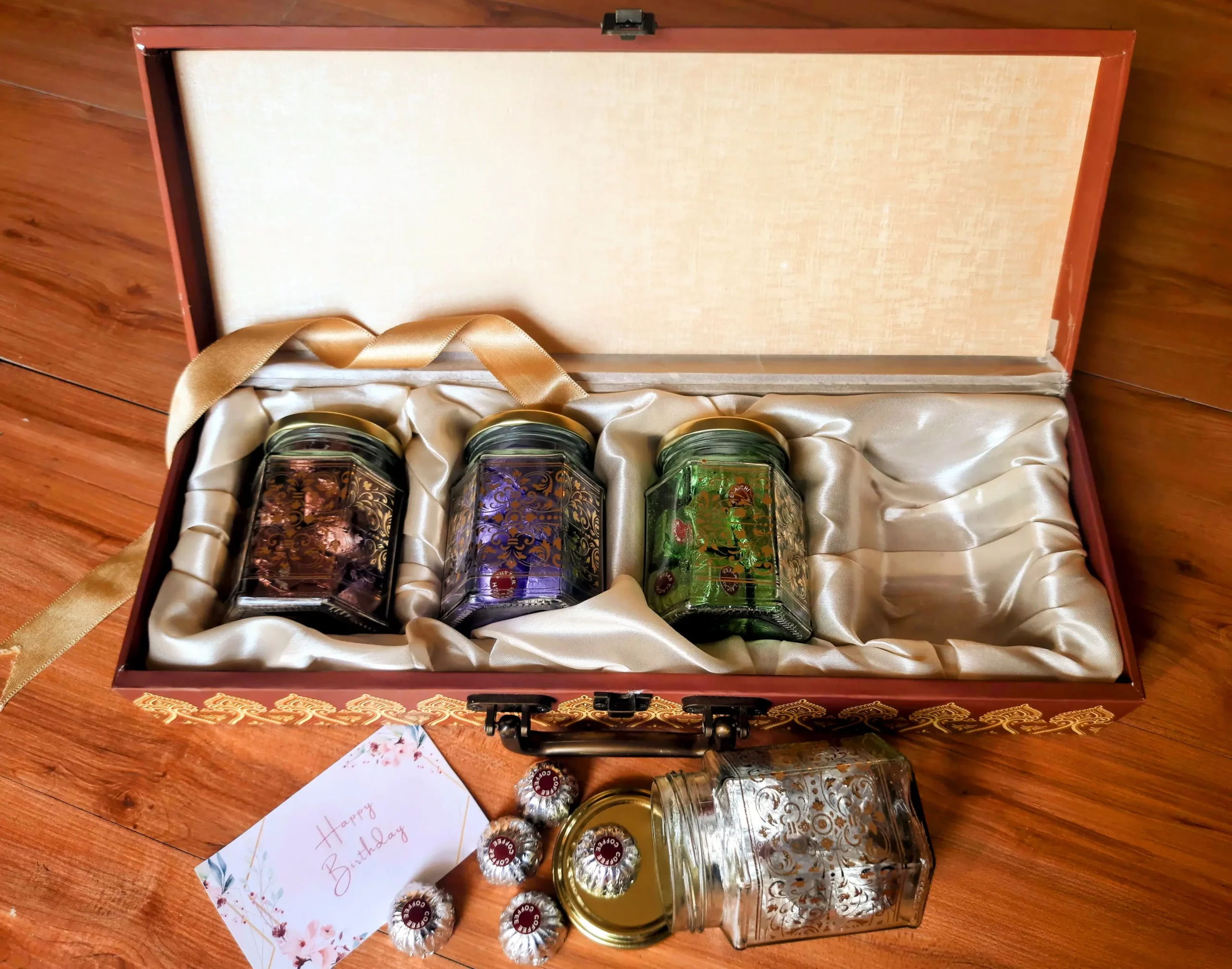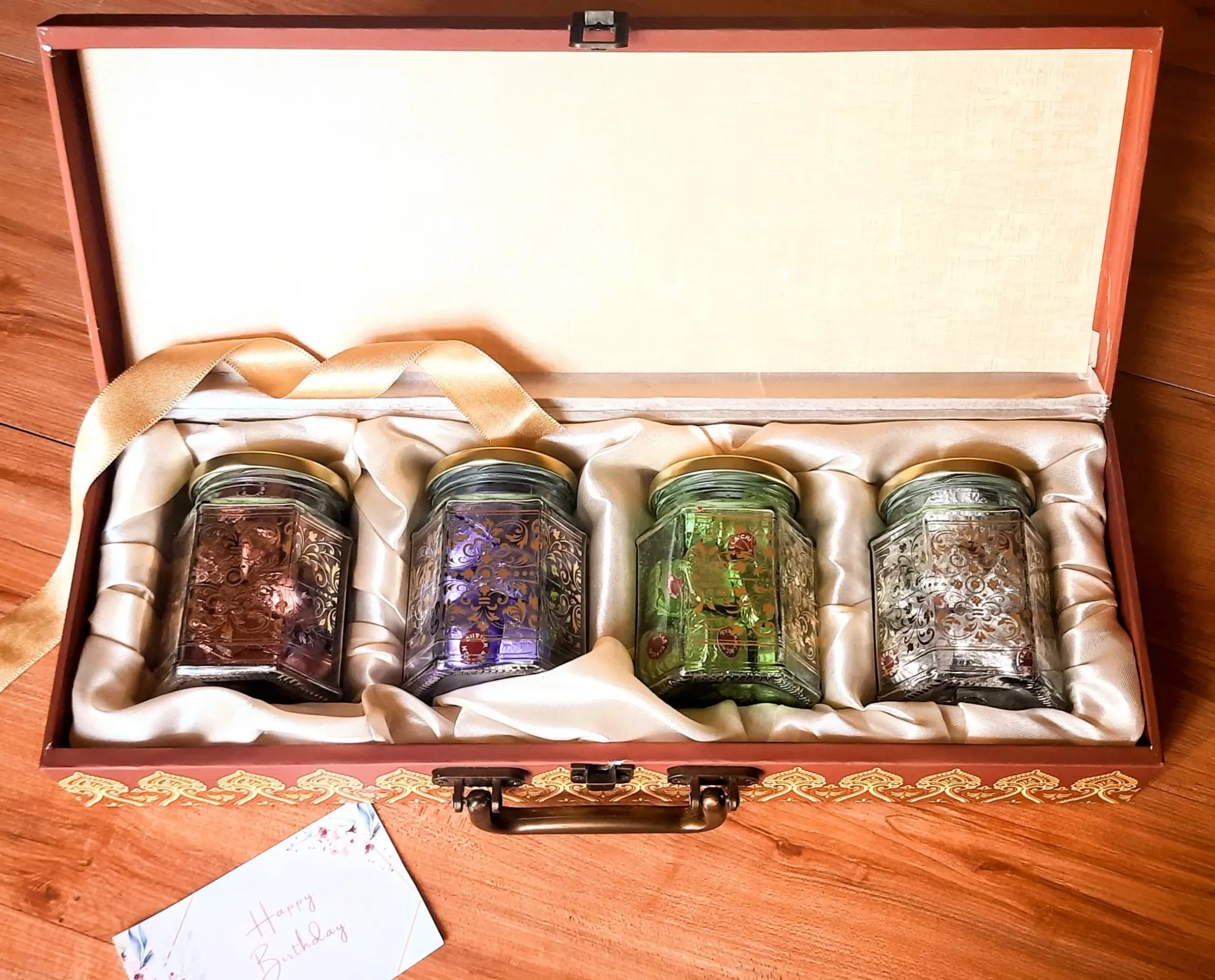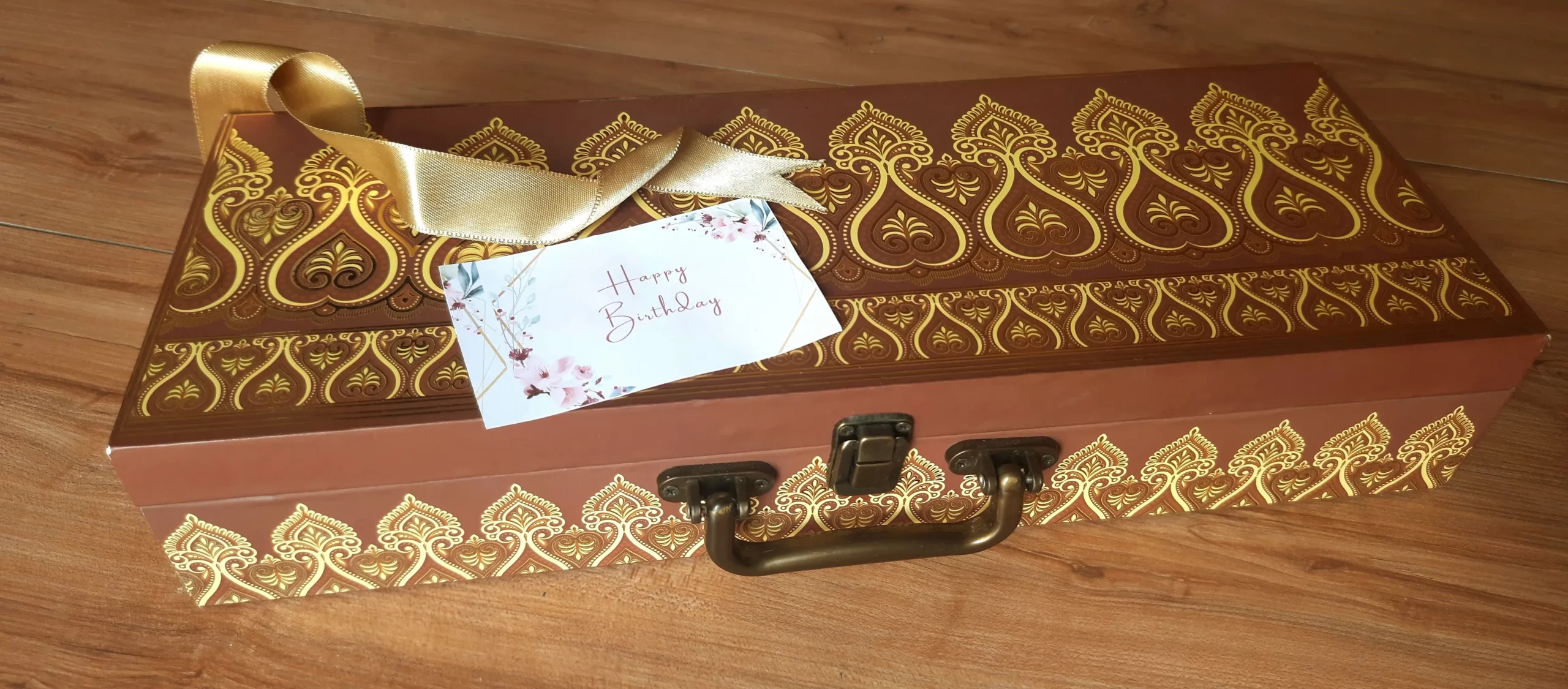 - Handcrafted Wooden Gift Box – A premium wooden box with intricate gold detailing, offering a timeless and elegant appeal.